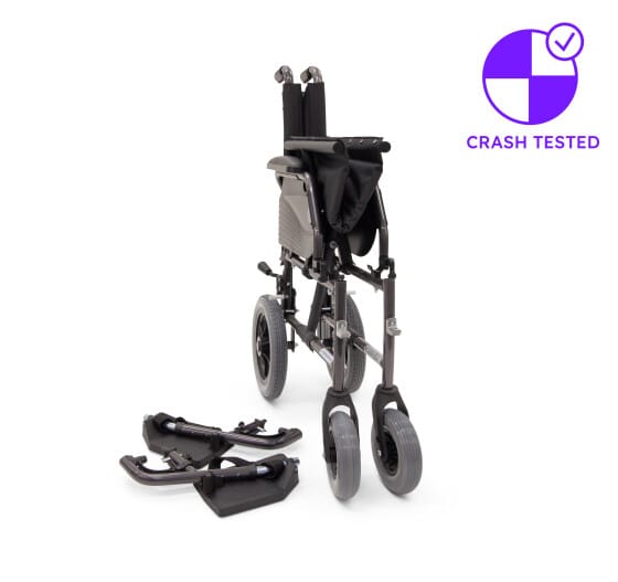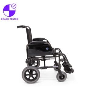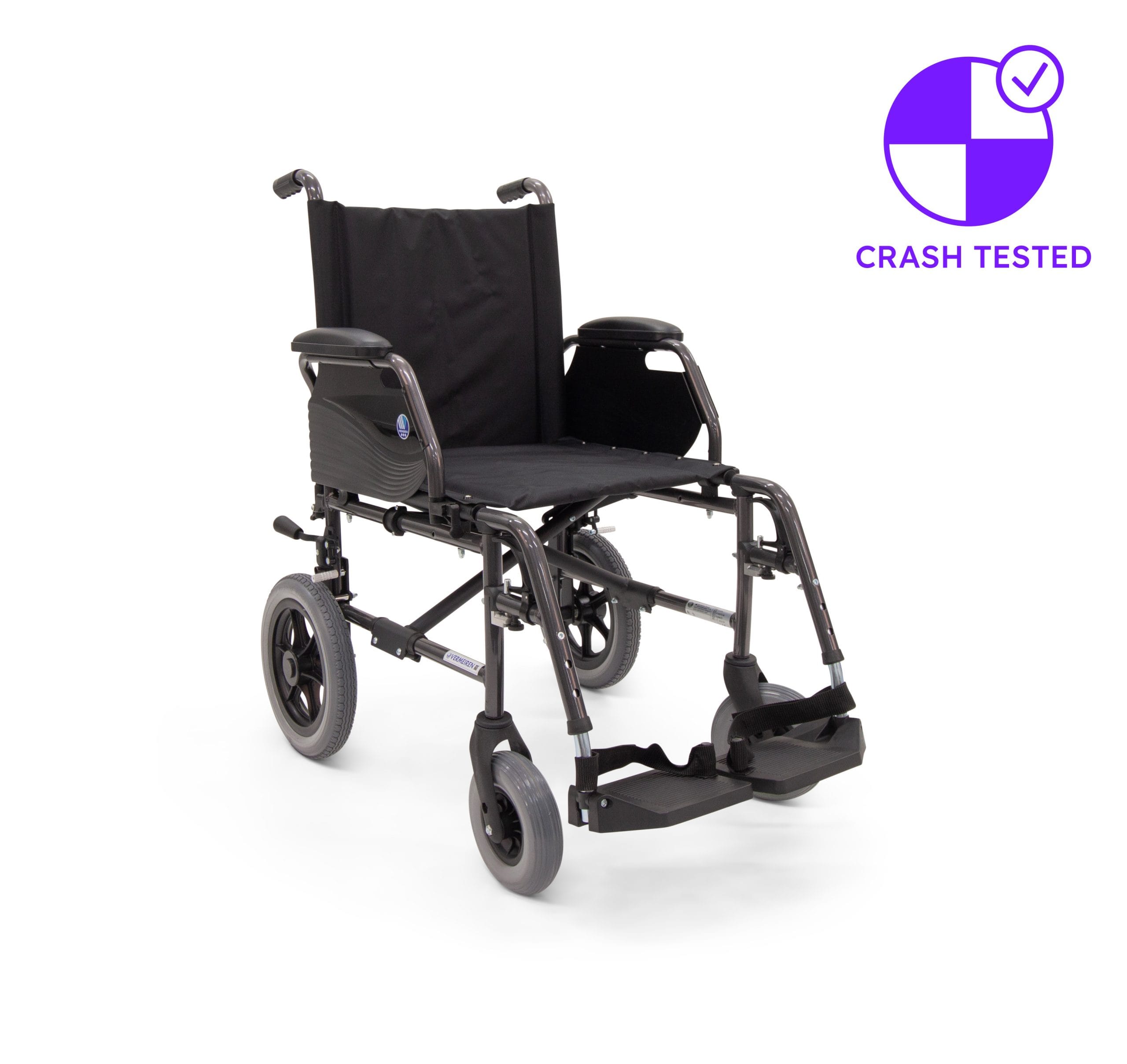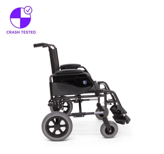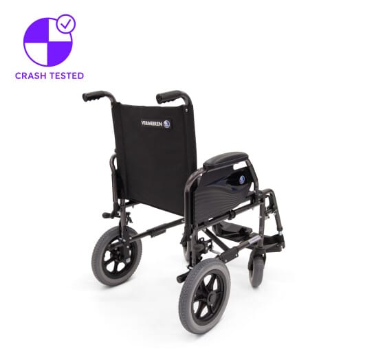 The Vermeiren Jazz transit wheelchair is an attendant-propelled, crash-tested wheelchair designed for reliability and ease of use. It features ergonomic handgrips, removable armrests, and adjustable leg rests for enhanced comfort. The wheelchair is lightweight, easily foldable for travel or storage, and includes swing-away footrests and foldable footplates to simplify transfers. Built to last and ISO 7176-19 compliant for safety.
